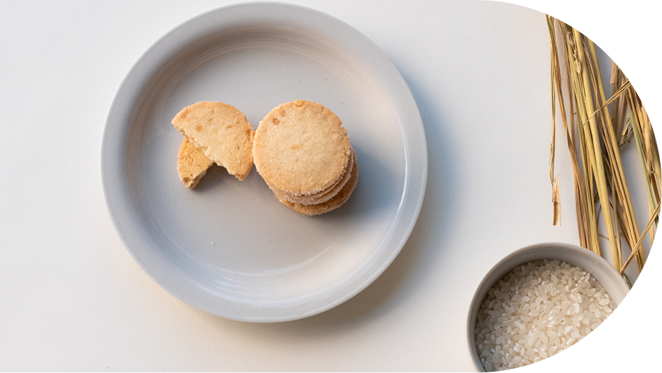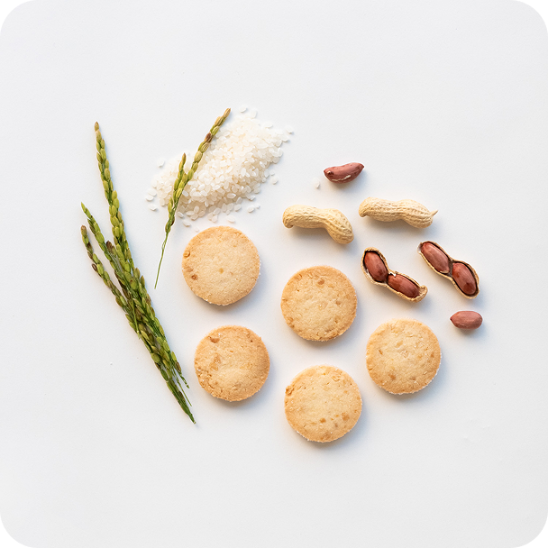 米粉を100%使って、すっと体に馴染むような、軽やかで口溶けの良いお菓子を作りました。米粉はコシヒカリとふさこがねの2品種のお米をブレンド。複数種を使用することで生まれる米粉の奥行きのある味わいと香りは、良質な油分を多く含む落花生との相性抜群。