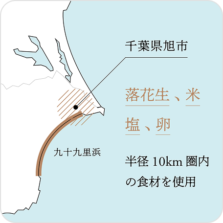 原材料は、九十九里浜のあたたかい太陽と心地の良い潮風をたっぷりと浴びた旭の食材たち。海水を汲み上げて釜で炊いた塩、平飼いですくすくと育ったにわとりの卵、そして、80余年に渡り問屋として地域の農家さんとともに歩んできた私たちが、自信をもっておすすめする落花生とお米。素材の生産方法や農法にもこだわり、食べることで千葉・旭から九十九里地域の自然を守りはぐくんでいくことを目指しています。