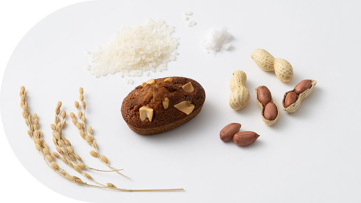 落花生の濃厚なペーストとバターを贅沢に練り込んで焼き上げた、米粉のみでできているとは思えないほどふんわりしっとりとしたフィナンシェ。落花生の上質な油分やはちみつの保水力により、長期間しっとりとした“生”食感をお楽しみいただけます。上にのせた大粒の落花生と旨みのある海塩がアクセント。オーブンで温めても、冷やしても、美味しくお召し上がりいただけます。